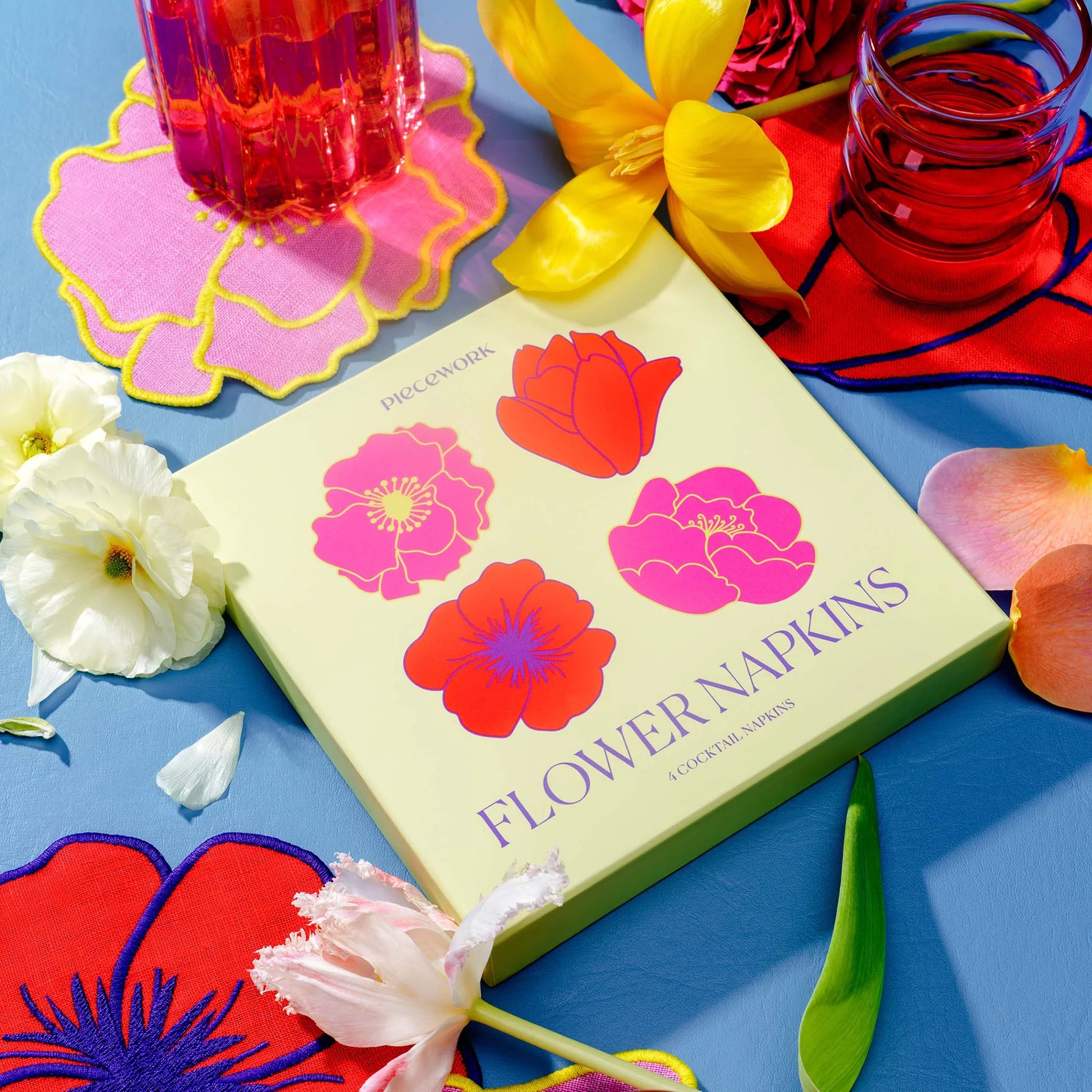 Brighten up your bar or party with these whimsical cocktail napkins. They come beautifully boxed, four to a set, made from die cut 100% linen with finished edges. Makes a beautiful gift!